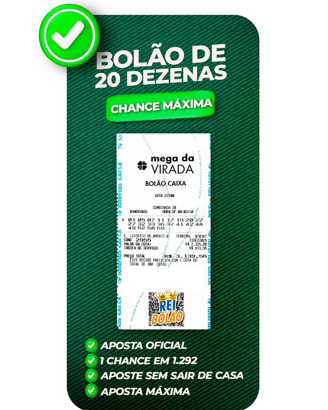 Jogar uma aposta com 20 dezenas custa R$ 232.560,00. Sim, você leu certo: duzentos e trinta e dois MIL reaisem um único jogo. Mas aqui vem a parte boa (e quase inacreditável):